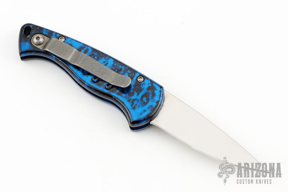 The Piranha Fingerling is a functional and stylish automatic knife. The action is fast and lockup is solid, so hang on tight! This Fingerling has a mirror finished drop point, 154-CM stainless steel blade with a partially serrated edge. The lightweight and sturdy 6061-T6 aluminum handles are anodized and feature recessed grooves for added gripping power. The knife is very thin, which makes it quite comfortable to carry with the tip-up titanium pocket clip.