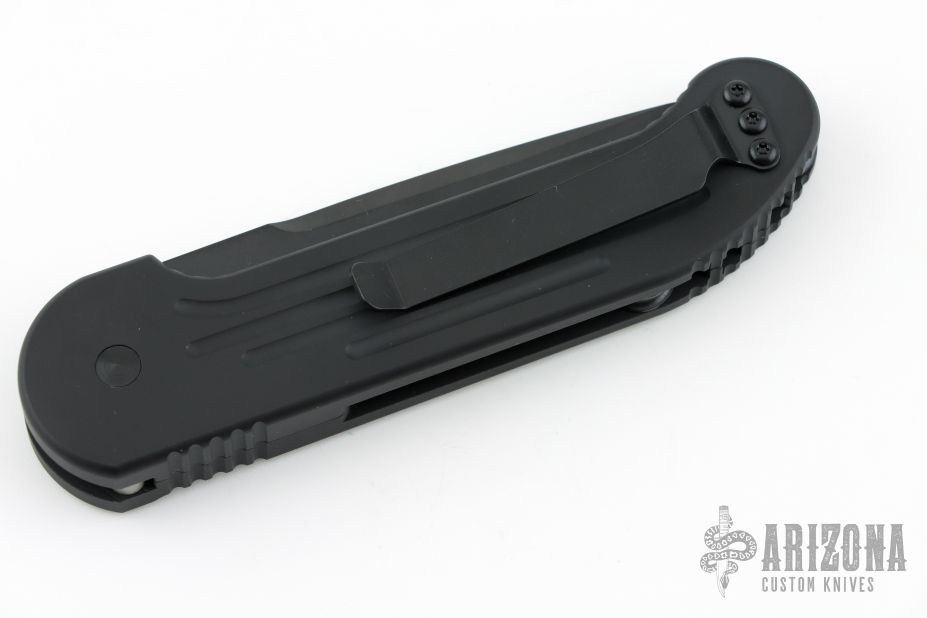 The L.U.D.T. (Large Underwater Demolition Team) is a nicely sized side opening automatic. The grip is firm due to the handle size, contour, horizontal milling of the frame and notched thumbrest on the frame spine. The high mount pocket clip allows the knife to sit deep in the pocket. This tactical model has all black fittings. Comes with original box, papers, and nylon pouch. Blade Steel: 440 HC, D-2, RC 59