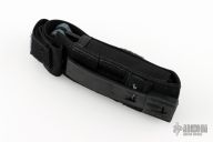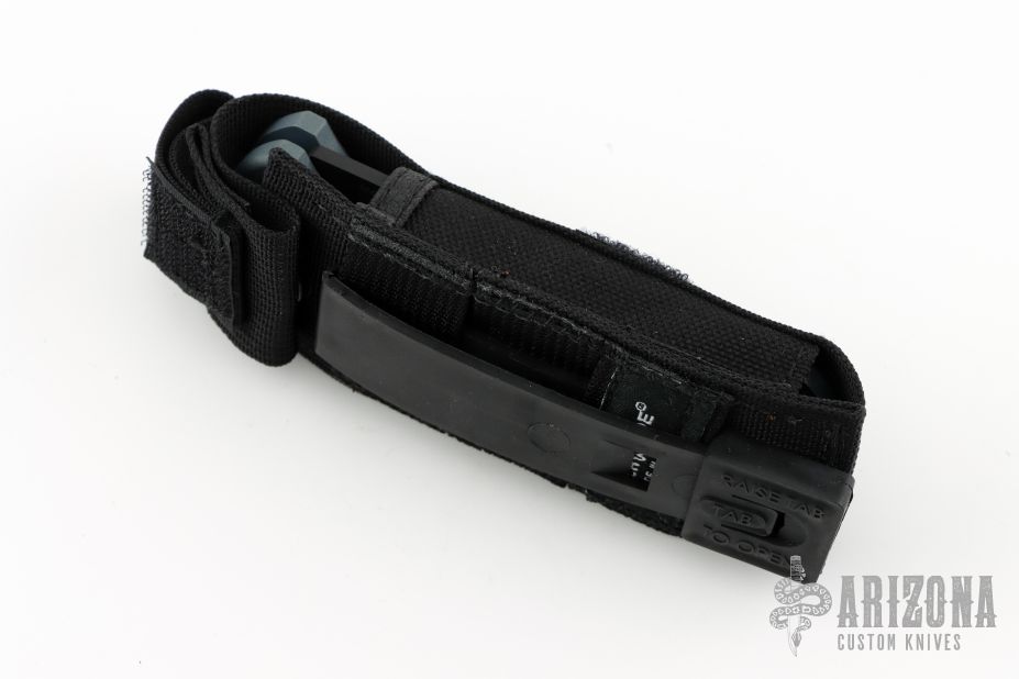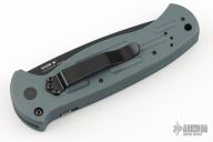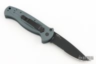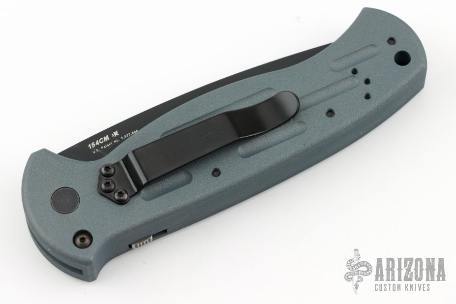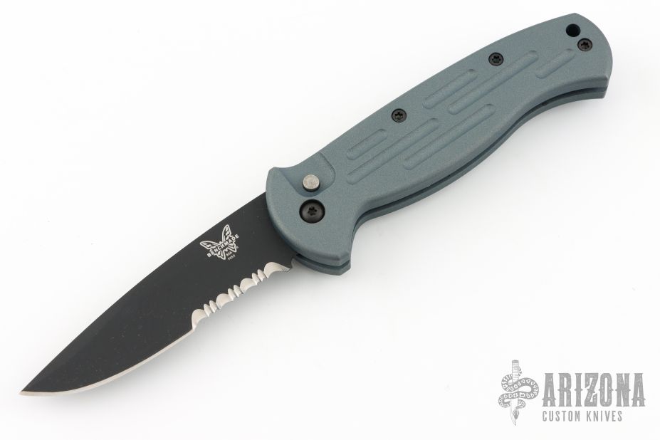 This 9050SBK-702 AFO auto has a black blade with partially serrated edge. Gray anodized aluminum handle. Integrated safety system. Black stainless steel clip - up or down reversible, and lanyard hole. Comes with original box, papers, and nylon sheath. Excellent condition.