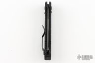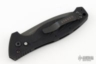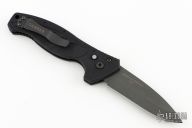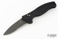 This Gerber Emerson Alliance tactical knife has a black finished 154-CM stainless steel partially serrated drop point blade. Handle is black anodized aluminum with milled scales and notched thumb rest, safety button, lanyard hole, and black stainless steel tip up clip. Comes with original box, papers, and nylon sheath. Has a couple light scuffs, otherwise excellent condition. This was the first auto that Gerber ever made.