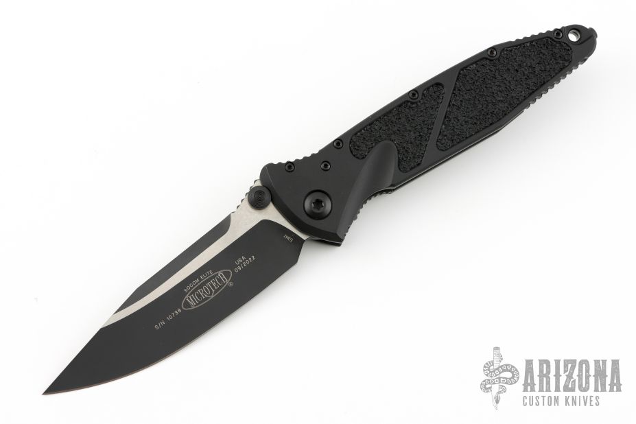 This Socom Elite from Microtech has a black/satin blade with dual thumbstuds and notched thumbrest. The handle has a black aluminum frame with non-slip rubber inserts and a tip down stainless steel clip, black hardware. Dated 09/2022 and S/N 10738. Excellent condition.