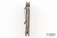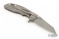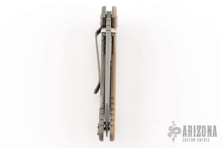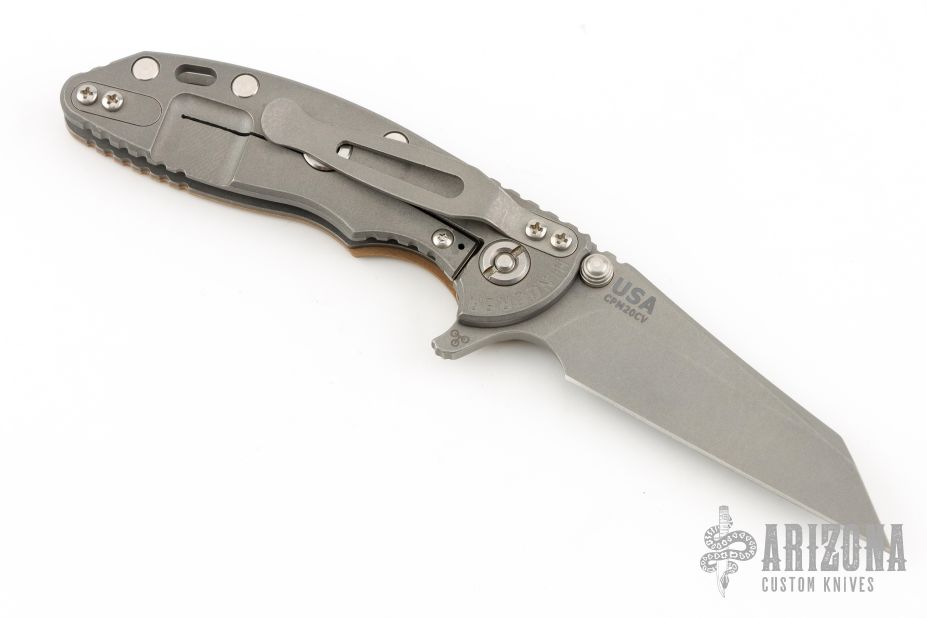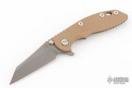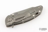 This XM-18 by Rick Hinderer features a working finished blade with notched thumbrest and flipper. The handle has an tan G-10 front scale, working finished titanium frame, stonewashed hardware, and a tip up or down reversible titanium clip and filler tab, lanyard hole at the butt. Excellent condition.