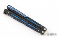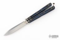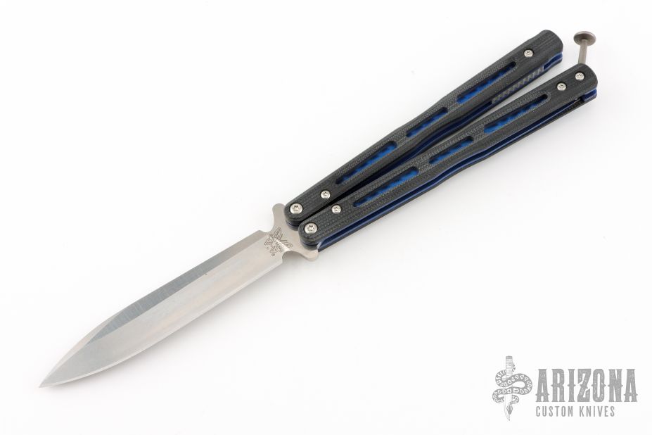 This Model 51 Morpho Balisong from Benchmade has a stonewash finished D2 stainless steel spear point blade. Handle is black G10 with blue jeweled/ anodized titanium liners and blue anodized titanium tip up clip. Excellent condition.
