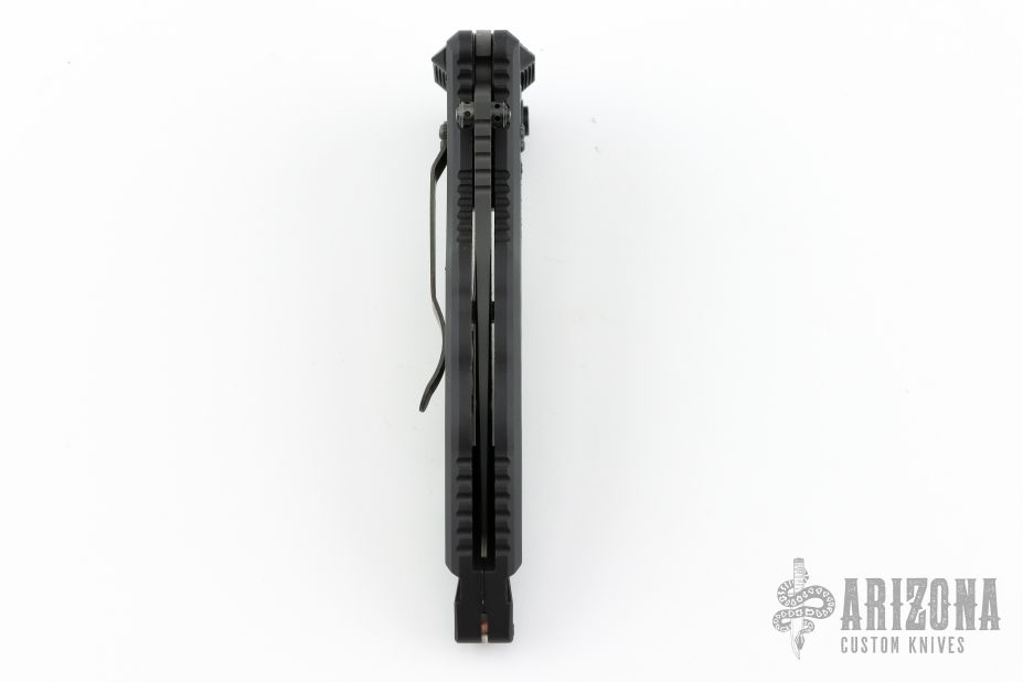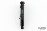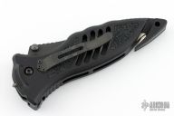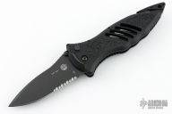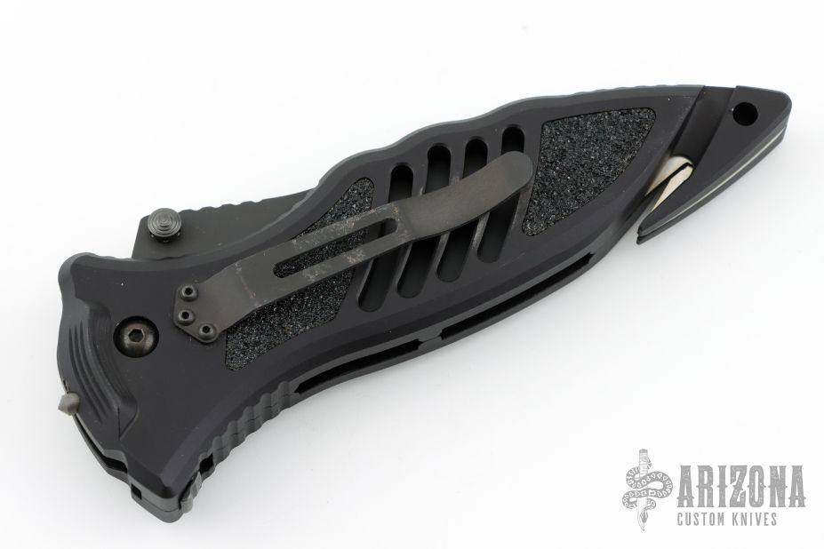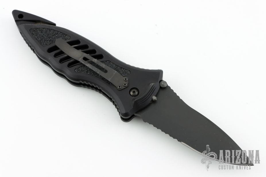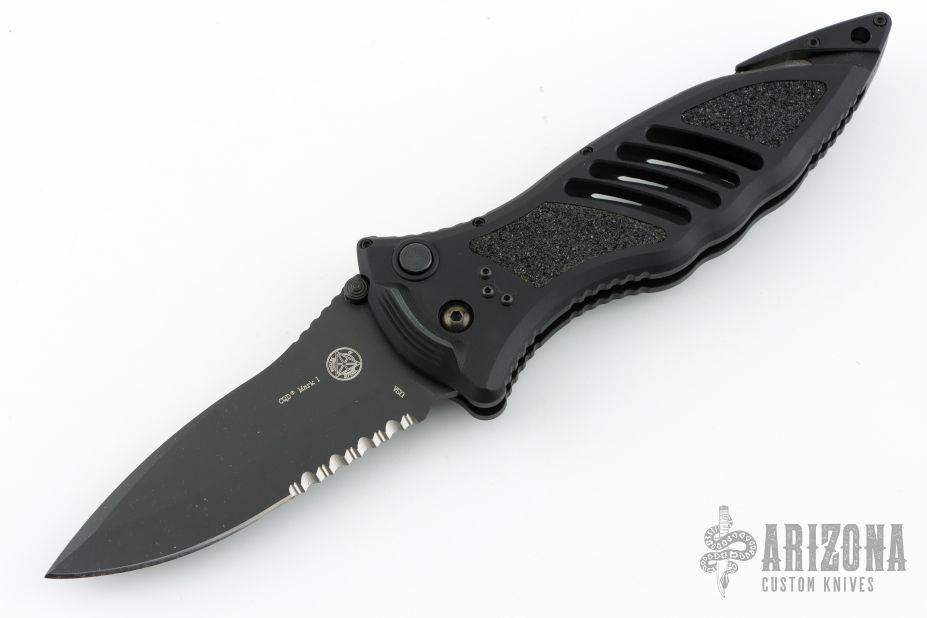 This CQD Mark 1 Auto from Masters of Defense has a spear point black blade with dual thumb studs and serrations. Handle is black aluminum with non-slip inserts, reversible black tip down clip, seat belt cutter, lanyard hole and glass breaker. Comes with original box, nylon sheath, and papers. Has a couple light scuffs, otherwise excellent condition.