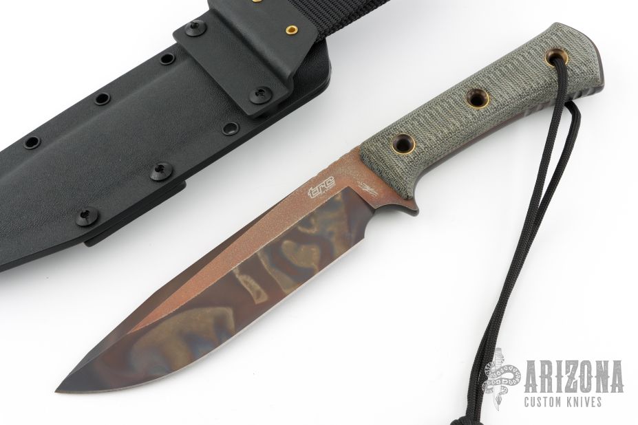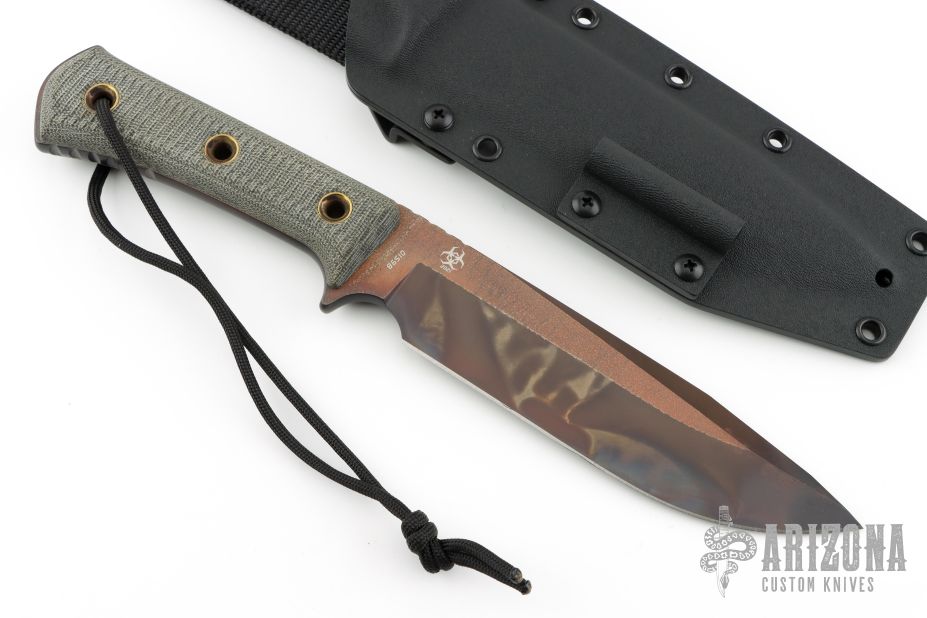 NAME: Apocalypse STEEL: Elmax FINISH: Apocalyptic BLADE LENGTH: 172mm OVERALL LENGTH: 300mm THICKNESS: 6.5 mm HANDLE: BCM SHEATH: Kydex WEIGHT: 398g Comes with original box, sheath and papers. #01598. Excellent condition.