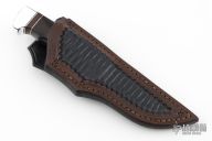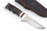 This Grizzly Hunter by Alan C Warren features a hand rub satin finished drop point blade with false top edge, .178" blade stock and 1.045" blade depth, hidden tang construction. The handle has a 416 stainless steel guard, African blackwood grip, and black/nickel silver/ironwood/walrus ivory spacers. Comes with hand tooled brown/black leather sheath. Excellent condition. #2579