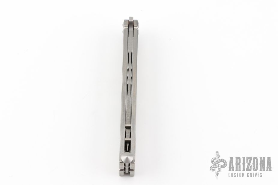 This Tachyon II balisong by Microtech has a stonewashed partially serrated tanto blade and skeletonized stonewashed titanium handles. Excellent condition. Dated 03/2013 and #00647. Comes with original box and papers. Excellent condition.