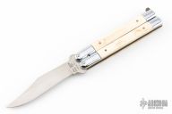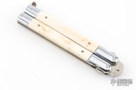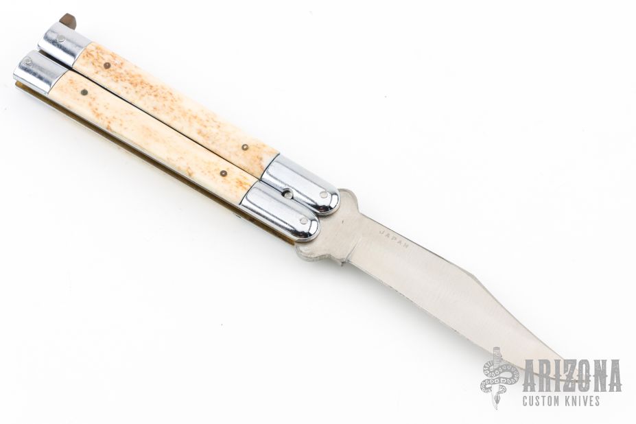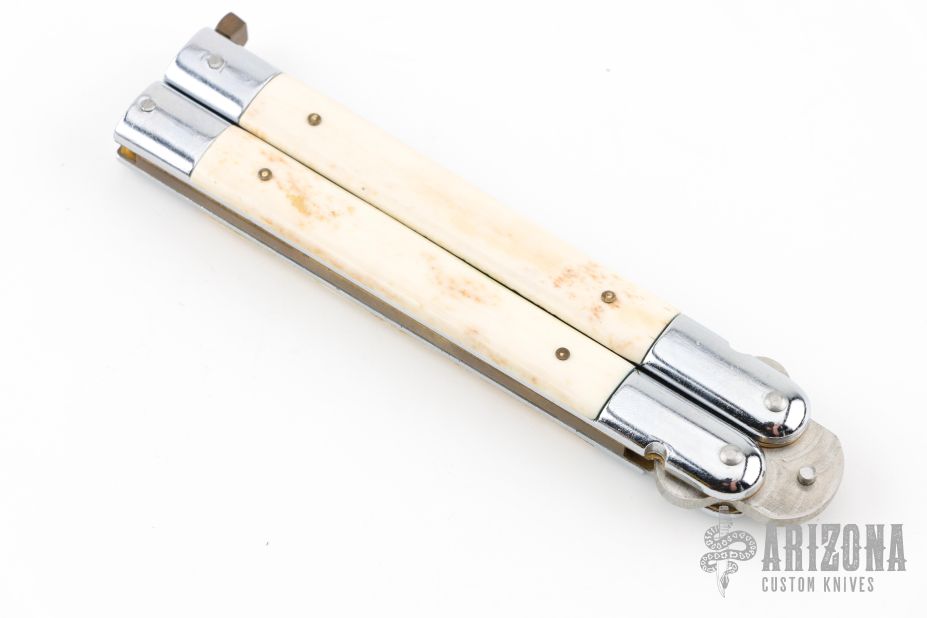 This balisong by Frost Cutlery features a satin finished clip point blade. It has brass channel construction handles with chrome plated overlays with bone inlays. Has a brass T-latch. Has some scratches, otherwise excellent condition. Comes with original box.
