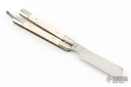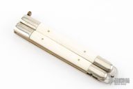This balisong by Fury features a satin finished clip point blade. It has brass channel construction handles with nickel silver bolsters and bone scales. Has a brass T-latch. Has some scratches, otherwise excellent condition. Comes with original box.