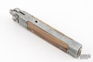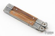 This Vintage Balisong by Toledo features a satin finished blade that is marked "MADE IN SPAIN". The handle has aluminum handles with acrylic inlays. Has a spring latch. Has scuffs, scratches, has been resharpened, fair condition. Comes with a black nylon sheath.