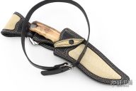 This Bowie by Spencer Aplin features a San Mai Damascus blade with fullers, .281" blade stock and 2.012" blade depth, hidden tang construction. The handle has mokume guard, fossil walrus ivory grip with a black spacer. Comes with a black leather sheath with white ostrich leg skin inlay. Excellent condition. Stunning!