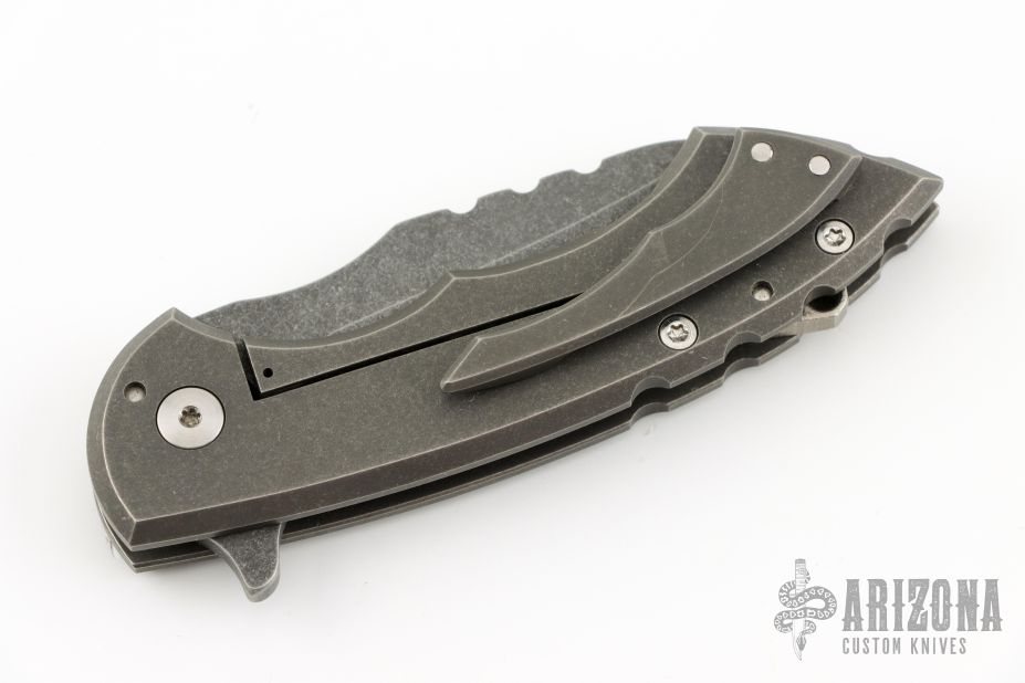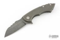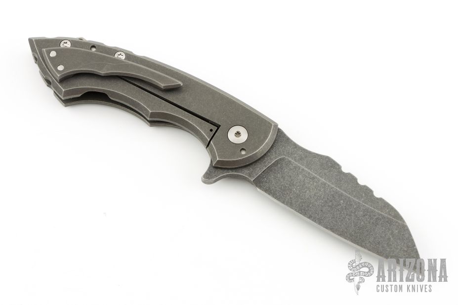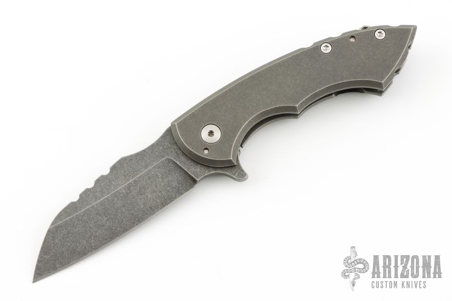 This Milliwatt Flipper by Brad Blount features a acid stonewashed blade with notched thumbrest and a flipper. The handle and an acid tumbled titanium frame with matching tip up clip. The blade is centered when closed and locks up with early lockup and no blade play, nice detent. Comes with a soft pouch. Has some scuffs on the blade and a scratch on the clip. Great condition otherwise.