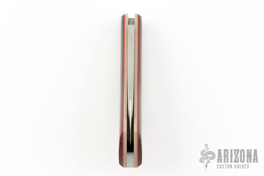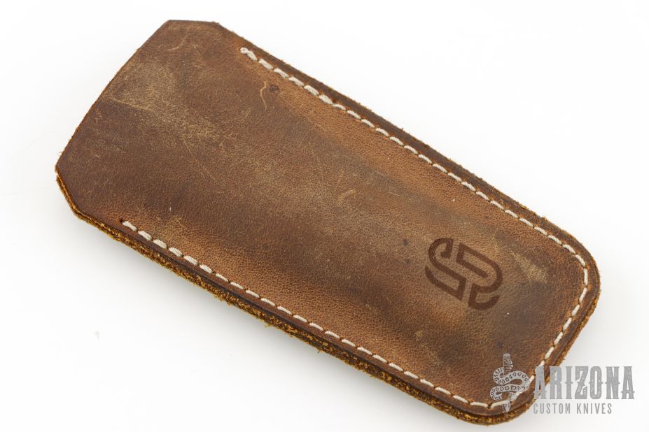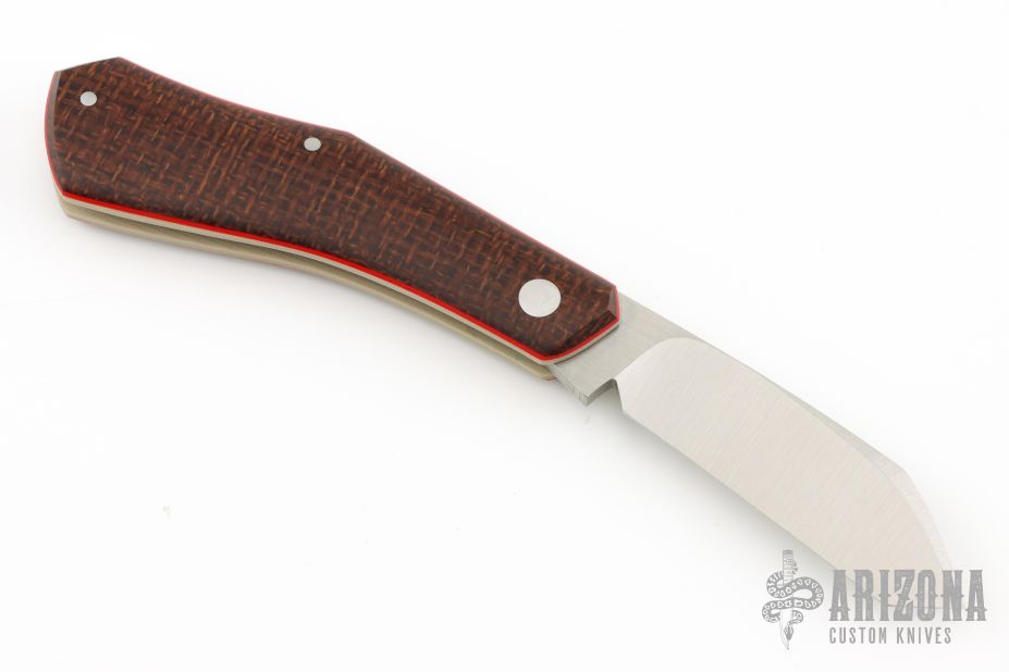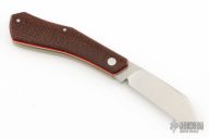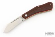 This slipjoint from Jared Oeser features barbed wire micarta covers over red/tan liners, and a steel spring. Hand rubbed satin finish blade with nail nick. Strong function. Spring is flush in closed, half stop, and open position.  Includes COA (10-22-18), Hank and a leather slip sheath.  There are a few light scuffs on the handle otherwise the knife is in Excellent Condition.