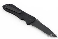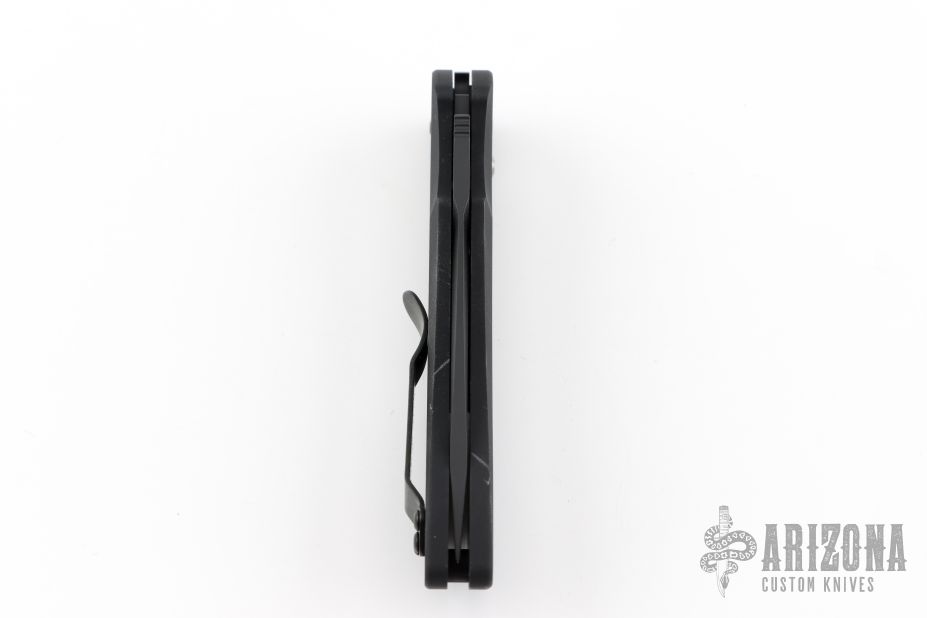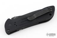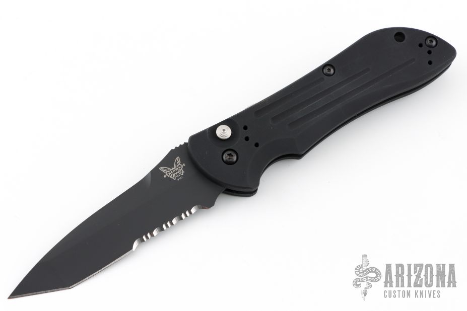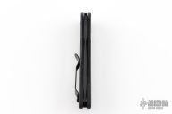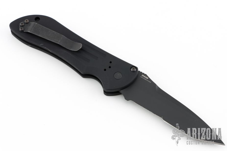 This 9101SBK AUTO Stryker from Benchmade features a black coated drop point tanto style blade with swedge, notched thumb rest and partial serrations. The handle is comprised of milled black aluminum frame with a black coated stainless steel tip up clip. Safety on backspacer and lanyard hole in pommel. Excellent condition. Comes with original box and papers.