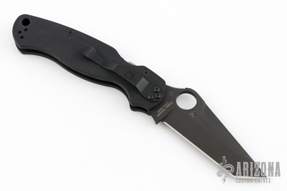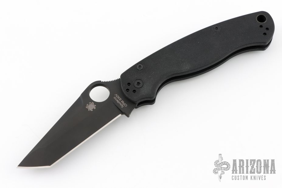 This G81GM4BKP2 Paramilitary 2 by Spyderco features a black tanto blade with thumb hole, notched thumb ramp and choil. The handle has textured black G10 scales over a stainless steel subframe and lockbar. 4 way adjustable pocket clip and lanyard tube in pommel. Includes original box and paperwork. New Condition.