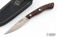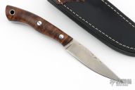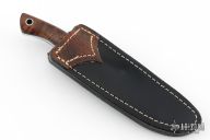 This Trout and Bird by Lon Humphrey features a satin finished blade with hammer marked flats, hand forged AEB-L steel, .130" blade stock and .796" blade depth, full tang construction. The handle has curly Tasmanian Blackwood scales with blue liners and steel pins and lanyard tube. Comes with a black/brown leather sheath. Excellent condition.
