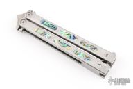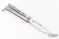This Balisong features a mirror polished blade with a false top edge and abalone inlays. The handle has satin finished stainless steel handles with abalone inlays and stainless steel spacers and T-latch. Comes with a zippered case and COA. Has a couple extremely light scratches, otherwise excellent condition.