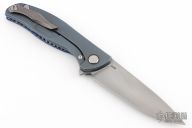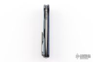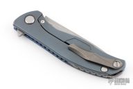 This Hati by Shirogorov Knives features a stonewashed blade with notched thumbrest and flipper. The handle has a blue twill carbon fiber and stonewashed and anodized titanium frame with matching tip up clip and backspacer with lanyard hole. Rides on bearings, nice detent, lockup and blade seating. Comes with original box and papers. Excellent condition.