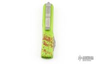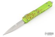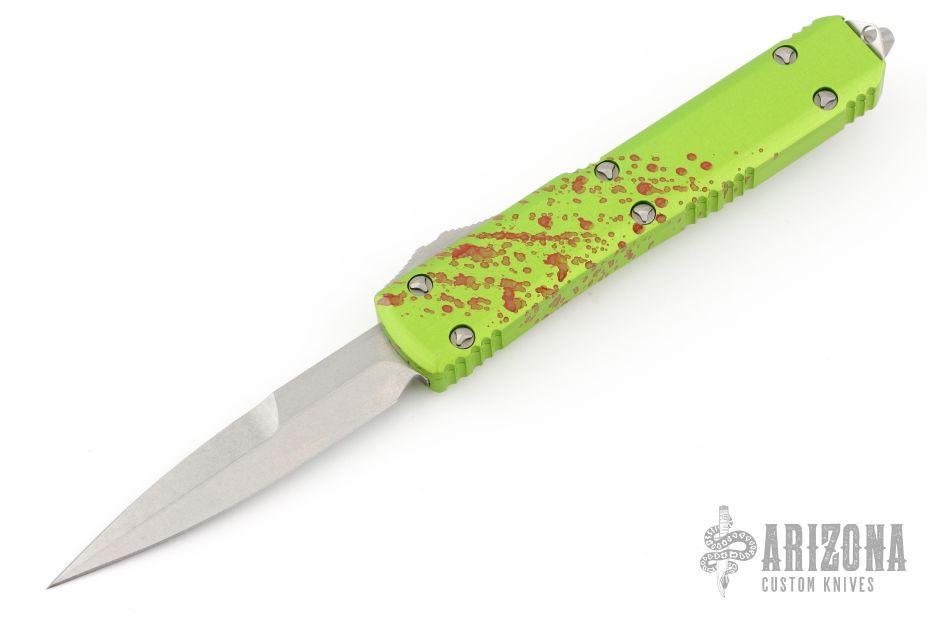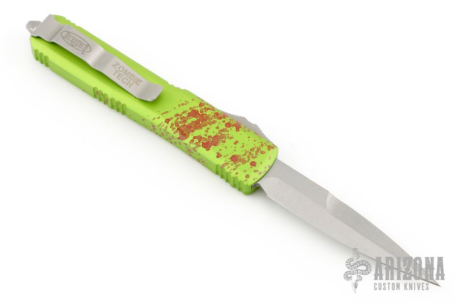 This Ultratech OTF automatic features a bayonet grind stonewash double edge blade with a standard edge and a green/red splatter anodized aluminum handle. Stainless steel clip. Glass breaker. Clip marked Zombietech. Comes with original box and papers. Excellent condition.