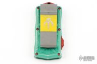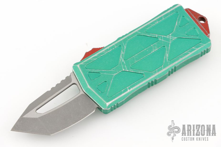 This Microtech Exocet features an apocalyptic finished tanto blade. The handle has a distressed green aluminum handle and a stainless clip that doubles as a money clip dated 01/2021, S/N 706. Comes with original box and papers. Excellent Condition.