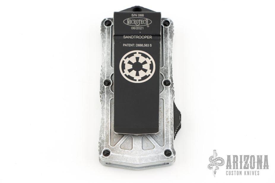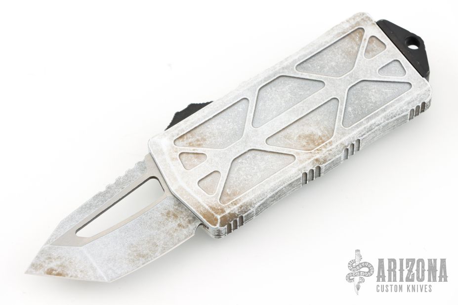 This Microtech Exocet features a distressed white finish tanto blade with satin flats. The handle has a distressed white aluminum handles and a black stainless clip that doubles as a money clip dated 06/2021, S/N 066. Comes with Microtech box and papers. Excellent condition.