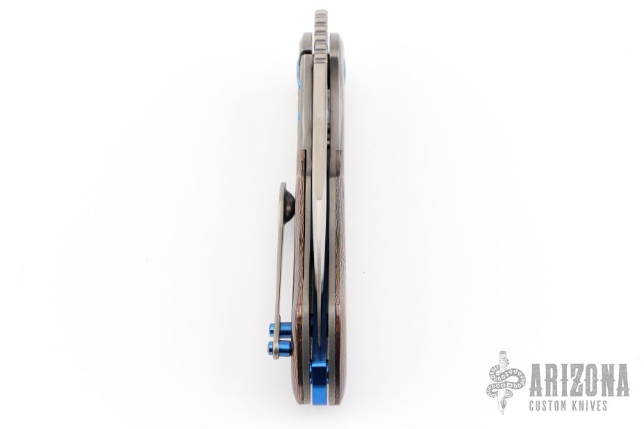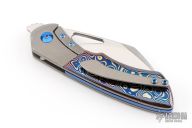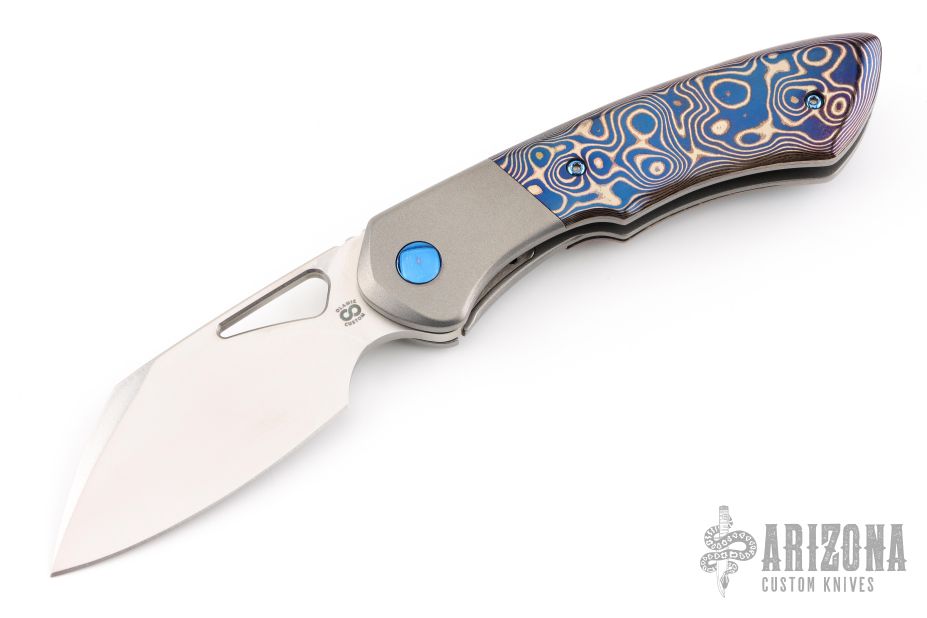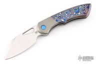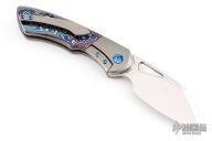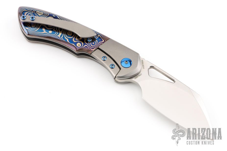 This Whippersnapper from Olamic Cutlery features a satin finished blade, thumbhole, notched thumbrest and front flipper. The handle has bead blasted titanium bolsters with integral liners, bead blasted titanium tip up clip, Fedokume scales, anodized titanium hardware. Nice detent, lockup and blade seating. Comes with maker's card dated 8/28/23. Includes a padded zippered case. Excellent condition.