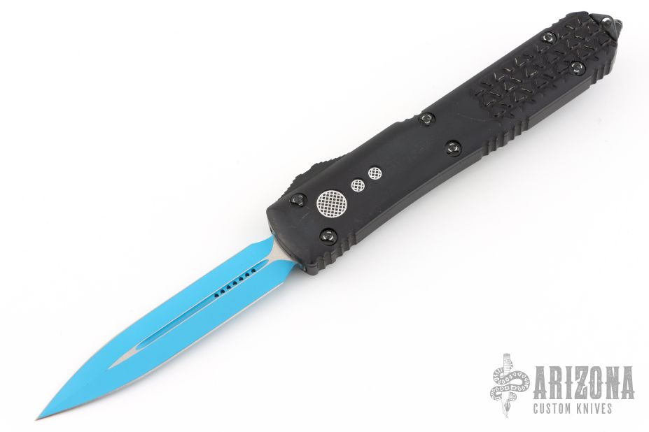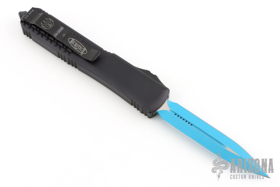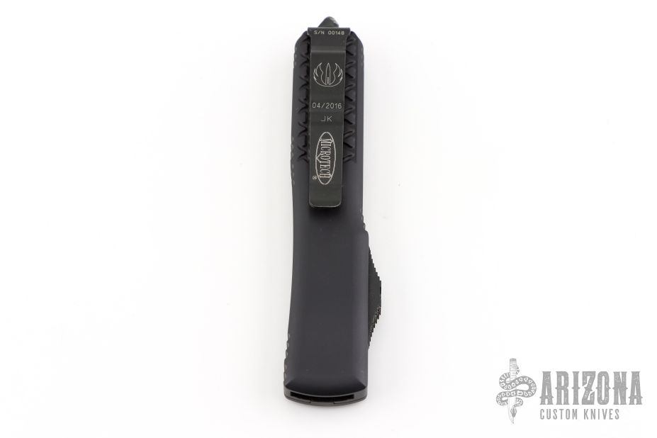 This Ultratech OTF automatic by Microtech features a D/E blue blade. Black aluminum contoured frame with black tip down stainless steel clip. Dated 04/2016 and s/n 00148. Comes with original box and papers. Has some scuffs on the clip and body otherwise Excellent Condition.