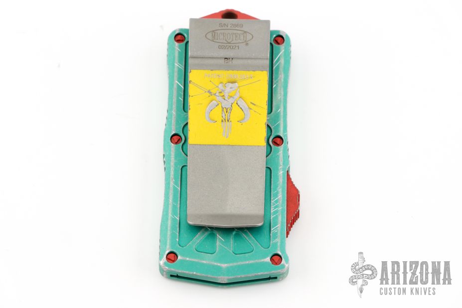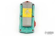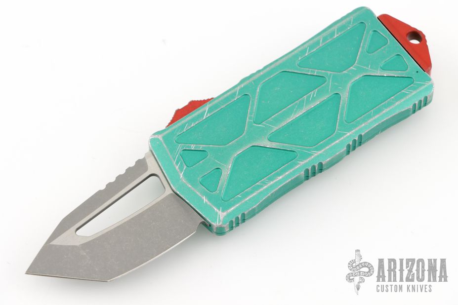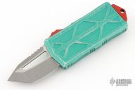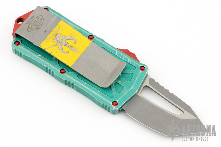This Microtech Exocet features an apocalyptic finished tanto blade. The handle has a distressed green aluminum handle and a stainless clip that doubles as a money clip dated 02/2021, S/N 2869. Comes with original box and papers. Excellent Condition.