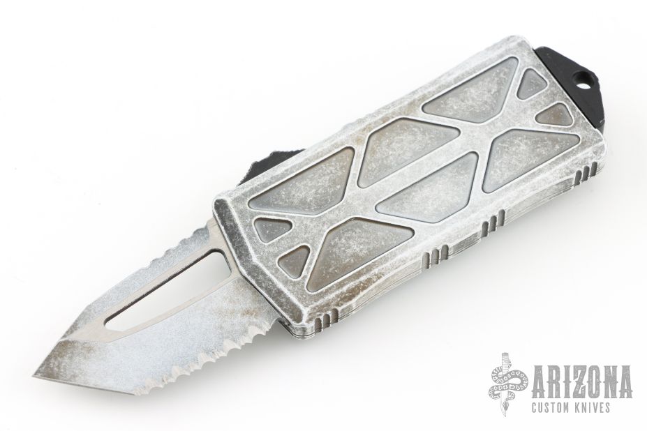 This Microtech Exocet features a distressed white finish tanto blade with full serrations and satin flats. The handle has a distressed white aluminum handles and a black stainless clip that doubles as a money clip dated 05/2021, S/N 007. Comes with original box and papers. Light wear is visible on the pocket clip otherwise the knife is in Excellent condition.