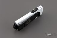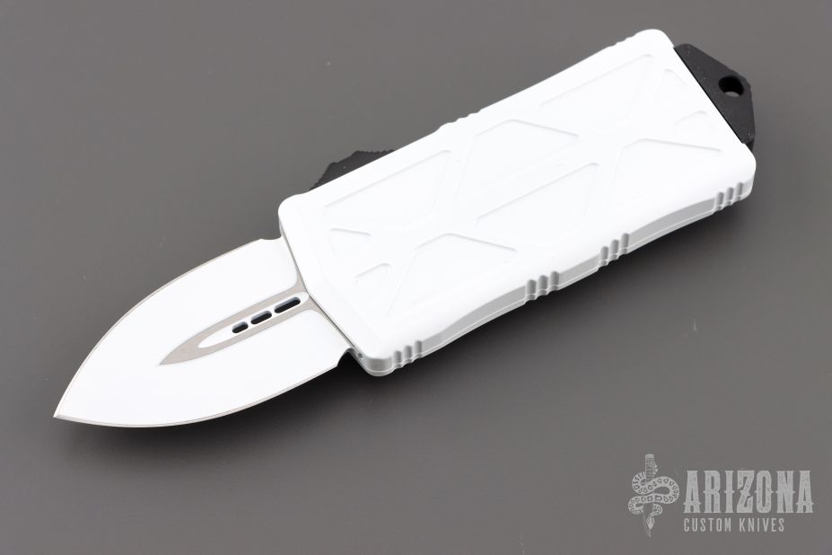 This Microtech Exocet features a white finish tanto clip point blade. The handle has a white aluminum handles and a black stainless clip that doubles as a money clip dated 05/2021 S/N 0465. Comes with original box and papers. Excellent condition.