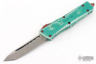 This Combat Troodon by Microtech features an Apocalyptic finished tanto blade. The handle has a distressed green aluminum frame with red hardware and a tip down stainless steel clip. Comes with original box and papers. Dated 10/2020 and s/n 1062. Excellent condition.