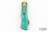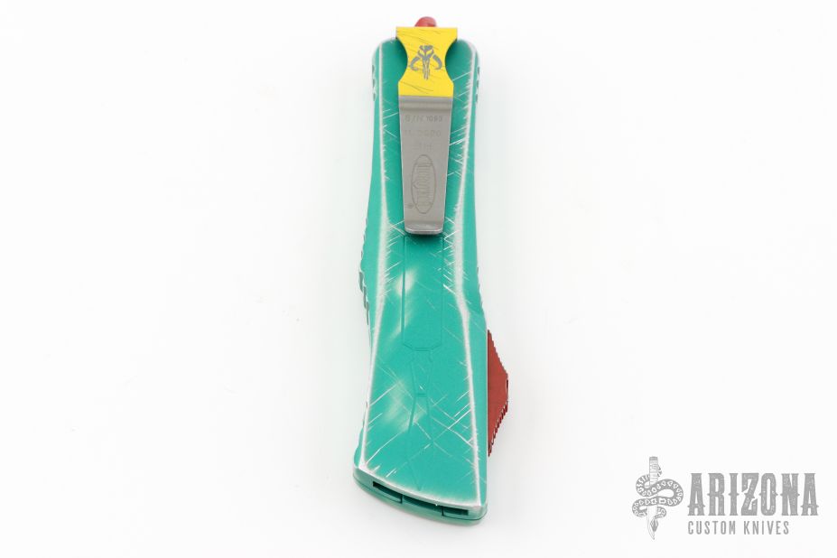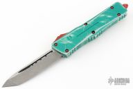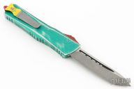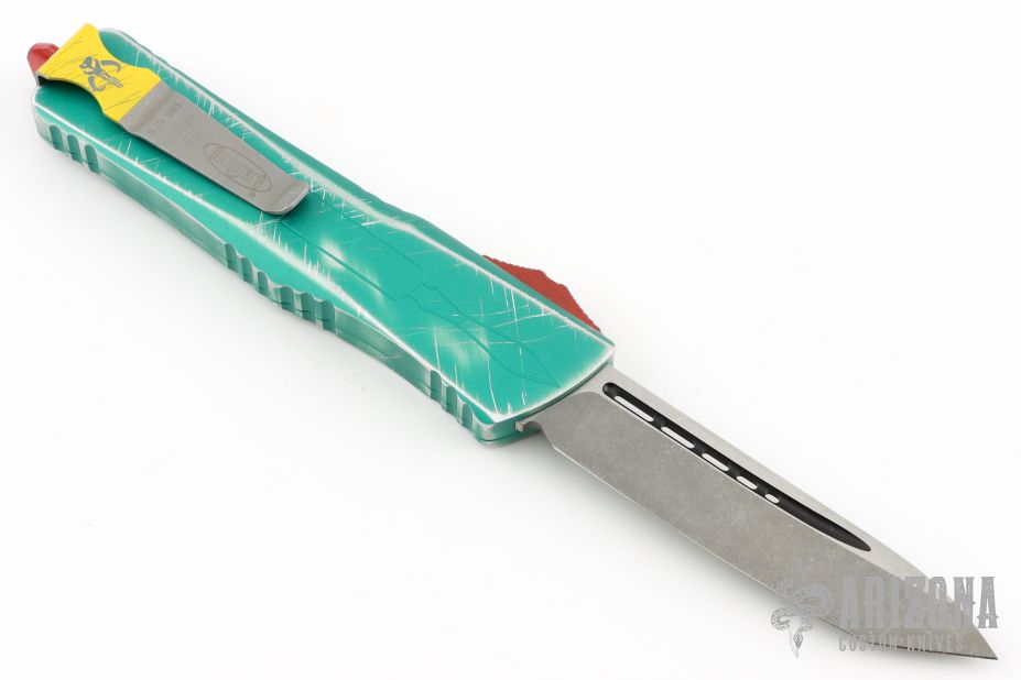 This Combat Troodon by Microtech features an Apocalyptic finished tanto blade. The handle has a distressed green aluminum frame with red hardware and a tip down stainless steel clip. Comes with original box and papers. Dated 11/2020 and s/n 1093. Excellent condition.
