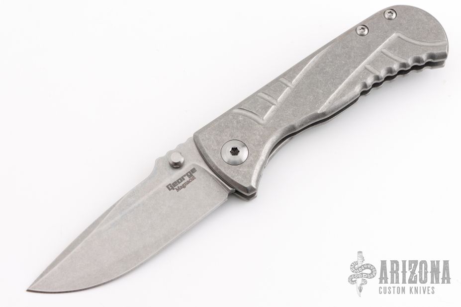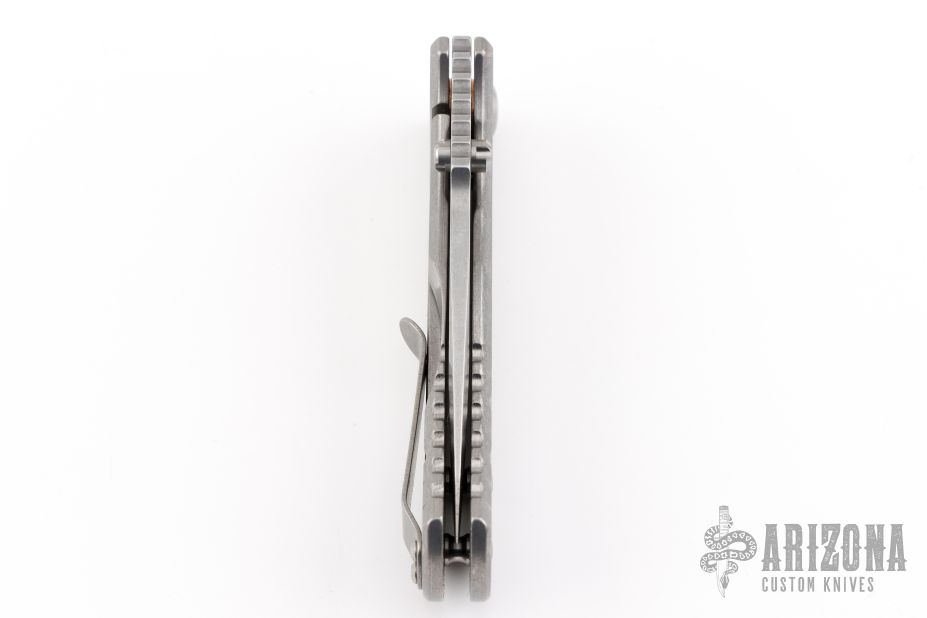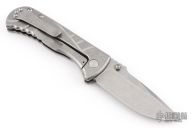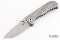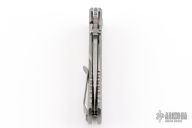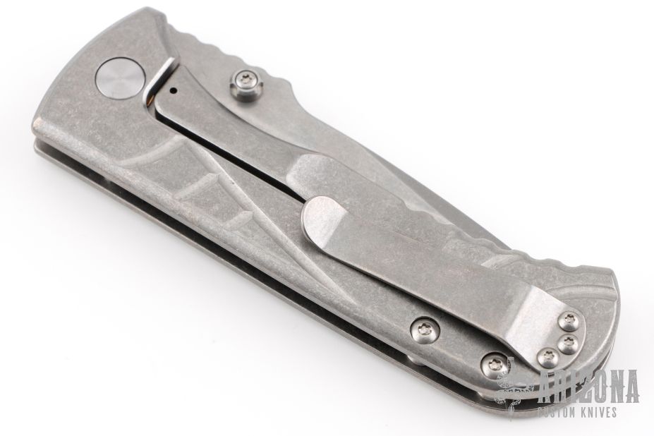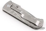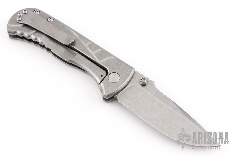 This Talos by Les George features a stonewashed blade with a false top edge, notched thumbrest and reversible dual thumbstud. The handle has a "Sweep" stonewashed titanium with matching tip up clip. Nice detent, lockup and blade seating. Very smooth action. New condition. Comes with original zippered case.