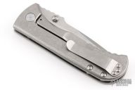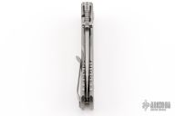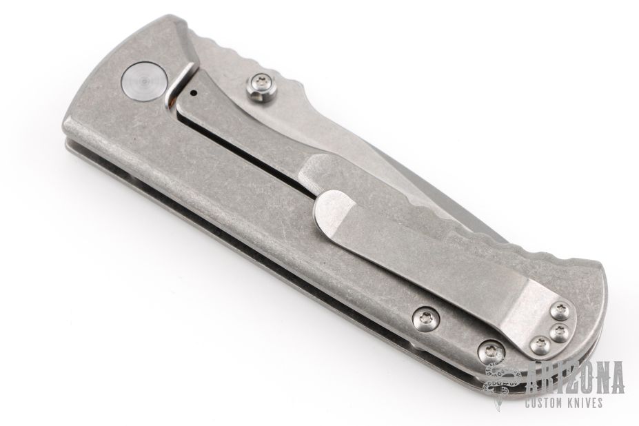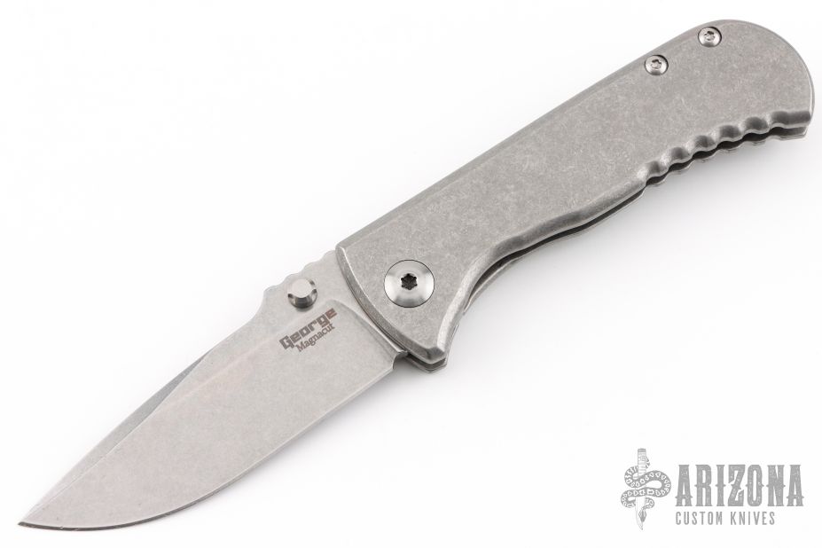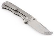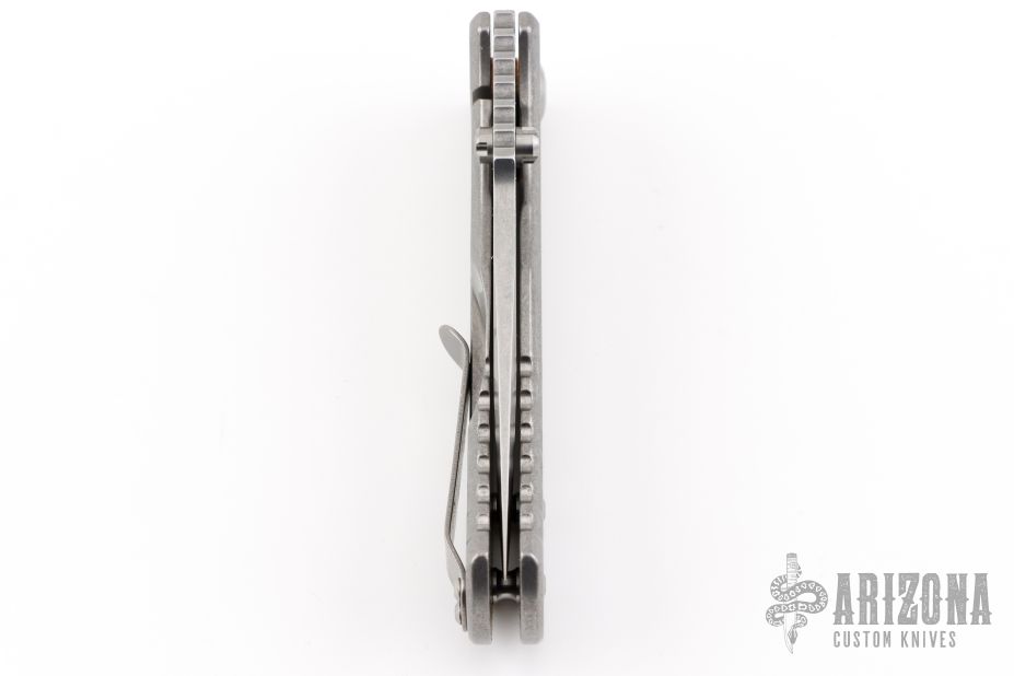 This Talos by Les George features a stonewashed blade with a false top edge, notched thumbrest and reversible dual thumbstud. The handle has a stonewashed titanium with matching tip up clip. Nice detent, lockup and blade seating. Very smooth action. Comes in maker's zipper case and with an extra clip. Excellent condition.