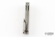 This SBTF by Borka Blades and John Gray features a satin finished blade with dual thumbstuds. The handle has an bark finished titanium frame with a matching tip up clip. Nice detent, lockup and blade seating. Comes with a zippered case. New condition.