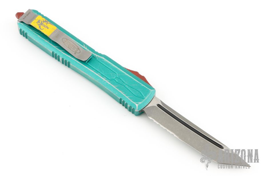 This StarWars themed Ultratech by Microtech knives features a partially serrated tanto blade with fullers and apocalyptic finish. The handle has a green battle worn aluminum frame with red and yellow hardware. Comes with original box and papers. Dated 07/2020 S/N3962. Excellent condition.