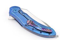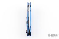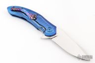 This QSB Gen3 by Peter Martin features a mirror polished blade with flipper. The handle has a milled and anodized titanium frame with mokuti tip up clip with hidden screws and mokuti backspacer, has anodized titanium hardware. Martin is signed on the inside of the backspacer. Has stainless steel lockface insert. Nice detent, lockup and blade seating. Includes a padded zippered case. New condition.