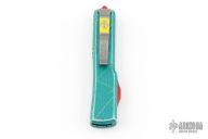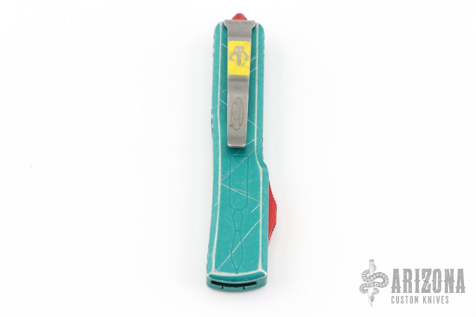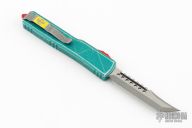 This UTX-70 OTF automatic by Microtech features an Apocalyptic finished blade with a standard edge. The handle has a distressed Bounty Hunter aluminum frame with stainless steel tip down clip. Dated 02/2023 and #762. Comes with original box and papers. Excellent condition.