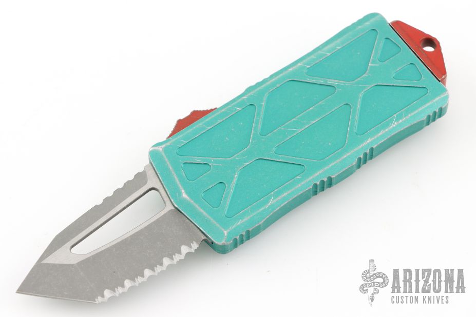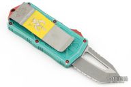 This Microtech Exocet features an apocalyptic finished tanto blade with serrations. The handle has a distressed green aluminum handle and a stainless clip that doubles as a money clip dated 03/2021 S/N 4319. Comes with original box and papers. Excellent Condition.