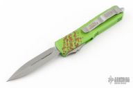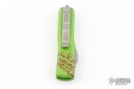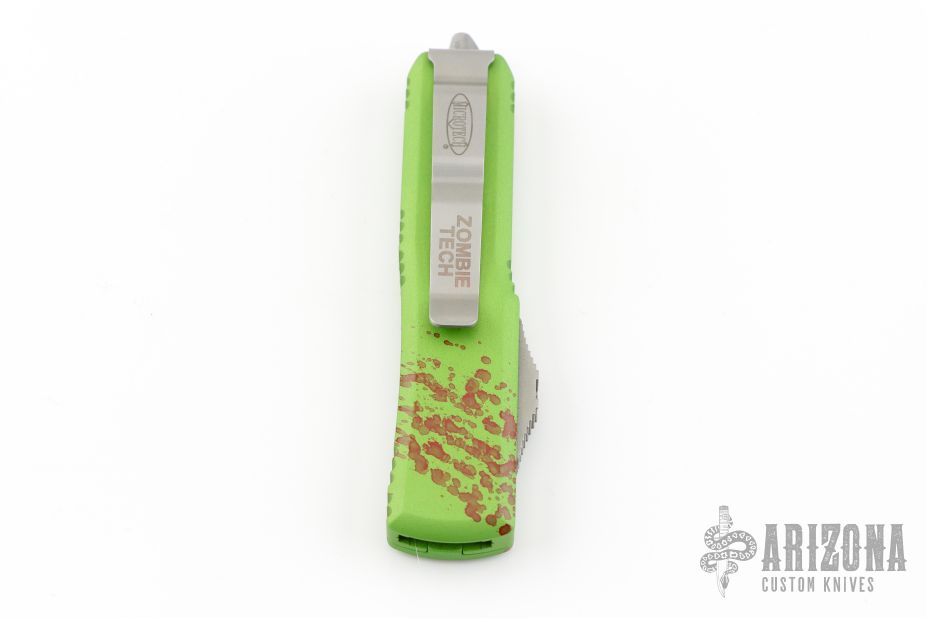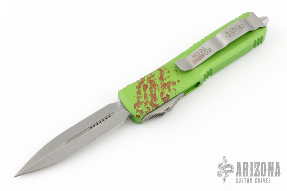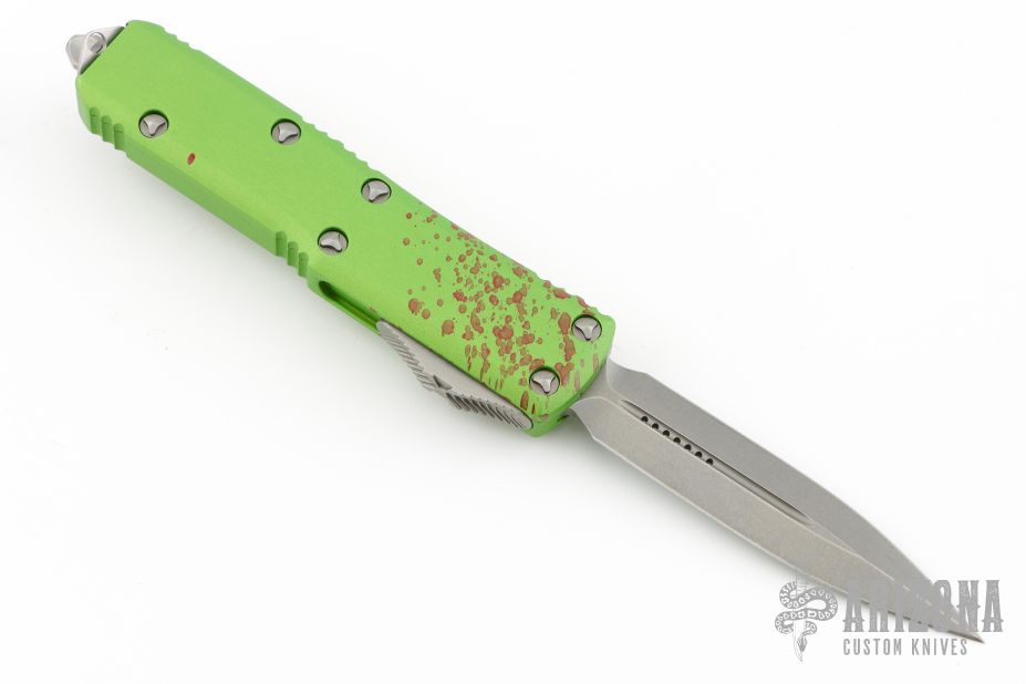 This UTX-85 OTF automatic by Microtech knives features a D/E stonewashed double-edged blade with a standard edge, and a green/red splatter aluminum handle with blasted hardware, tip down carry. Glass breaker. Clip marked Zombietech. Comes with original box and papers. Excellent condition.