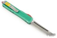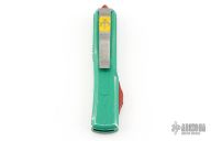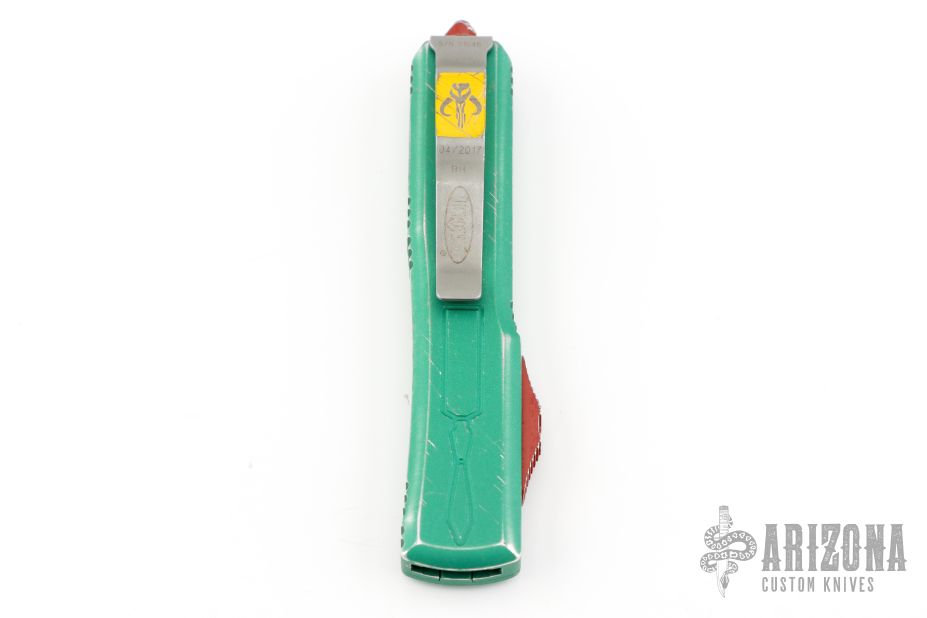 This StarWars themed Ultratech by Microtech knives features a fully serrated tanto blade with fullers and apocalyptic finish. The handle has a green battle worn aluminum frame with red and yellow hardware. Comes with original box and papers. Dated 04/2017 and s/n 01646. Excellent condition.