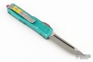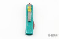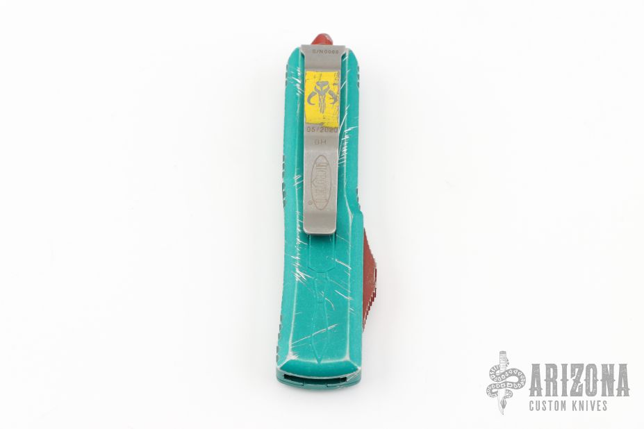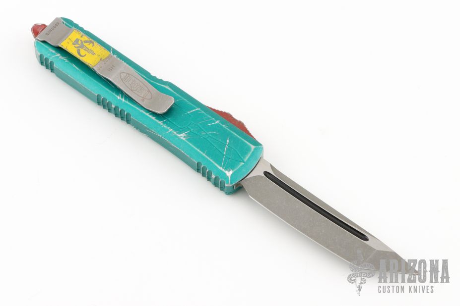 This UTX-85 Bounty Hunter by Microtech features a tanto blade with fullers, satin flats and apocalyptic finished grinds. The handle has a green battle worn aluminum handle with red hardware, tip down apocalyptic finished stainless steel clip. Comes with original box and papers. Excellent condition. S/N 0069 and dated 05/2020.