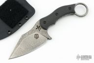This SRambit by John Gray and Borka Blades features an acid rain finished blade with false top edge and notched thumbrest, .208" blade stock and 1.820" blade depth, full tang construction with carbon fiber scales. Comes with Kydex sheath. Excellent Condition.