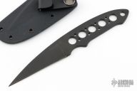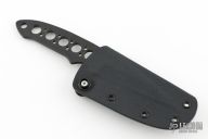 This Kasper Cutter from Crawford features a black blade with a skeletonized grip to reduce weight. Filed thumbrest and index finger notches, .150" spine thickness and 1 inch blade depth. Comes with a kydex sheath with "J" hook (so it can be worn inside the waistband). Has a couple light scuffs, otherwise excellent condition.