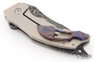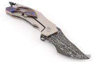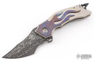 This Tomahawk Flipper by Burn Knives features a Mike Norris Stainless Damascus blade with Stellite Core, notched thumbrest and flipper. The handle has a satin finished titanium frame with Nebula Timascus overlay, carbon fiber backspacer, tip up Nebula Timascus clip with hidden screws. Rides on bearings, has nice detent and blade seating. Has a little vertical blade play, otherwise excellent condition. Comes with a COA dated 7-16-20.