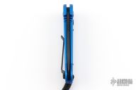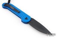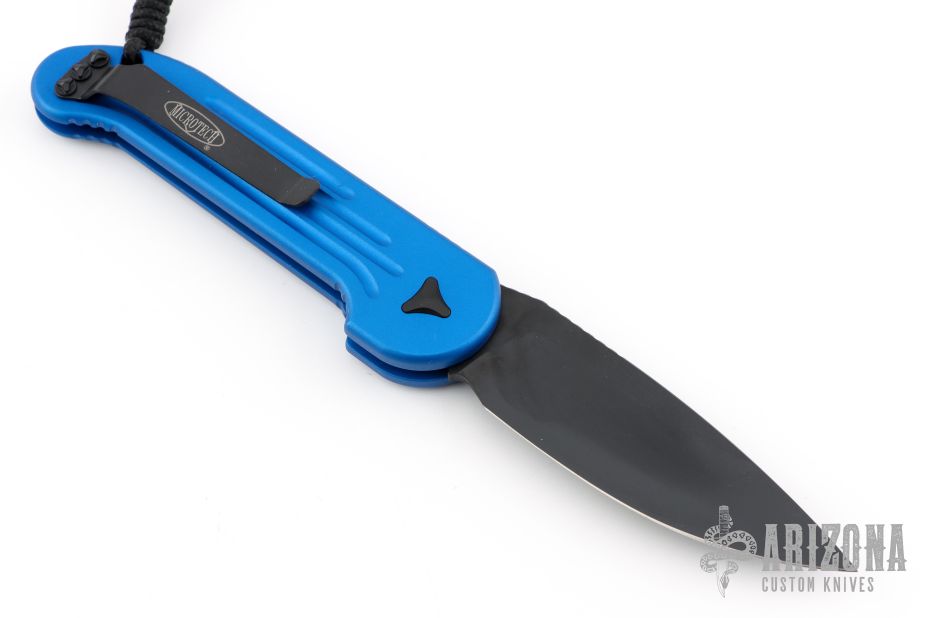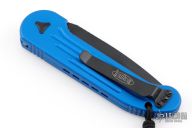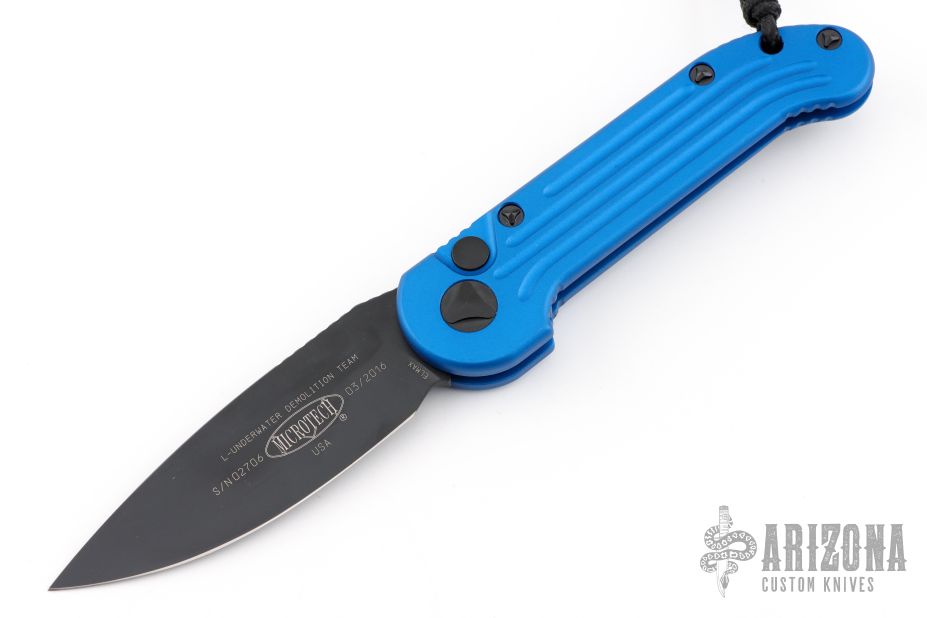This LUDT side opening automatic by Microtech has a black finished blade with a standard edge and a contoured blue aluminum frame. Stainless steel clip. Dated 03/2016 and serial number 02706. Comes with a Microtech box and papers. Excellent condition.