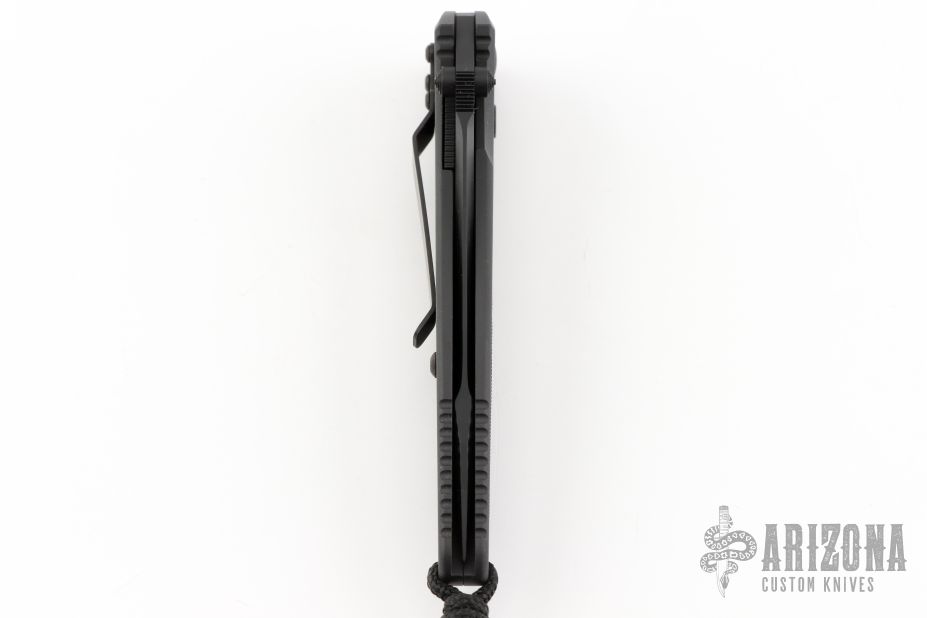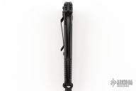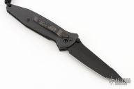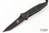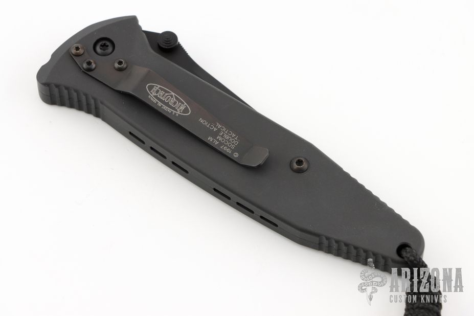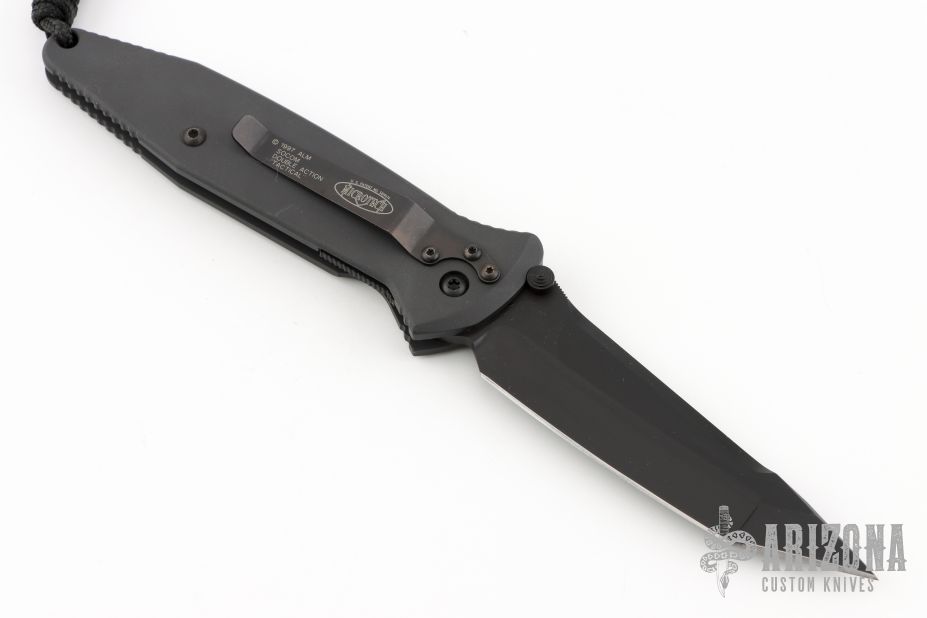 This Socom D/A tactical side-opening automatic by Microtech has a black coated tanto plain edge blade. Dated 5/2000; S/N 009. Has a black aluminum handle with rubber inserts, all hardware including clip is matte black. Strong action and perfect lockup. Comes with original box, papers, and belt sheath. Has a couple light scuffs on the frame, excellent condition otherwise.