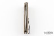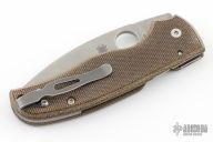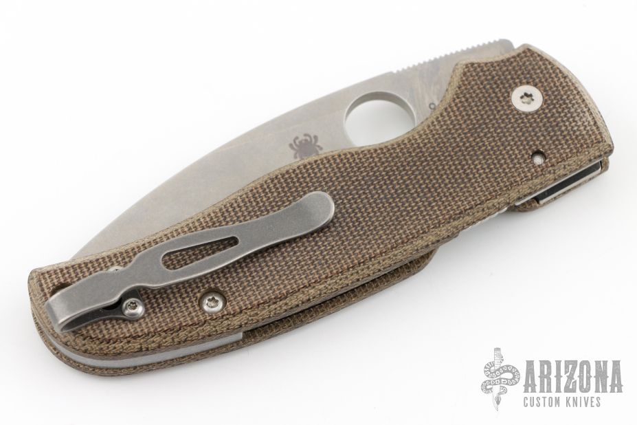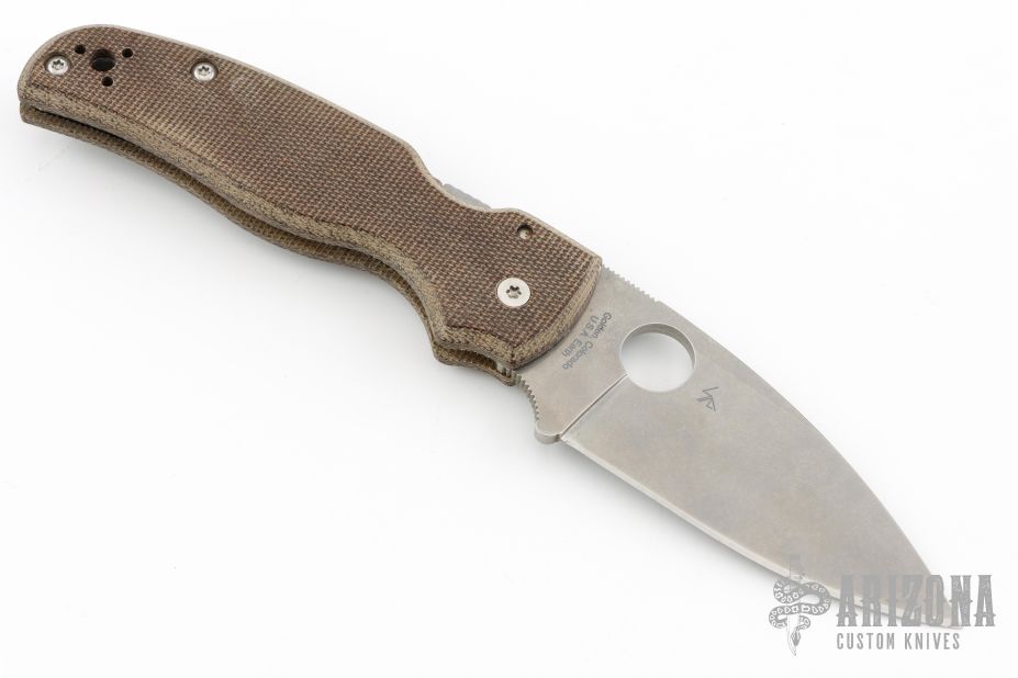 This Shaman Pln by Spyderco features a stonewashed spear point blade with notched thumb and finger rests, thumbhole. The handle has custom green canvas micarta scales, inlaid stainless steel liners and a stonewashed stainless steel backspacer, tip up reversible stainless steel clip, lanyard hole at the butt. Has a small nick near the tip of the blade, otherwise excellent condition.