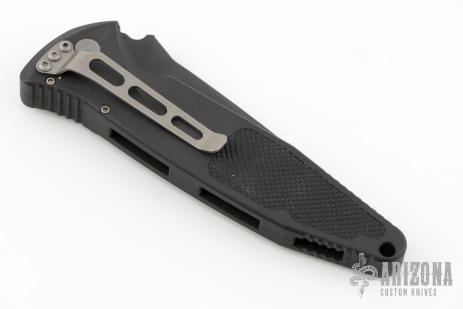 This Socom Elite automatic folder by Microtech Knives has a black tanto blade with notched thumbrest. The handle is comprised of black aluminum with non-slip inlays, stainless steel clip positioned for tip down carry, and lanyard hole at the pommel. Serial number 0798 and dated 03/2001. Comes with original box, sheath and papers. Has a few scuffs, otherwise Excellent condition.