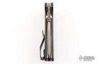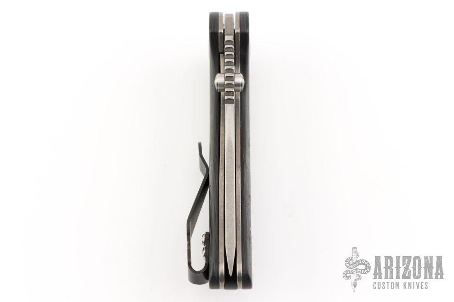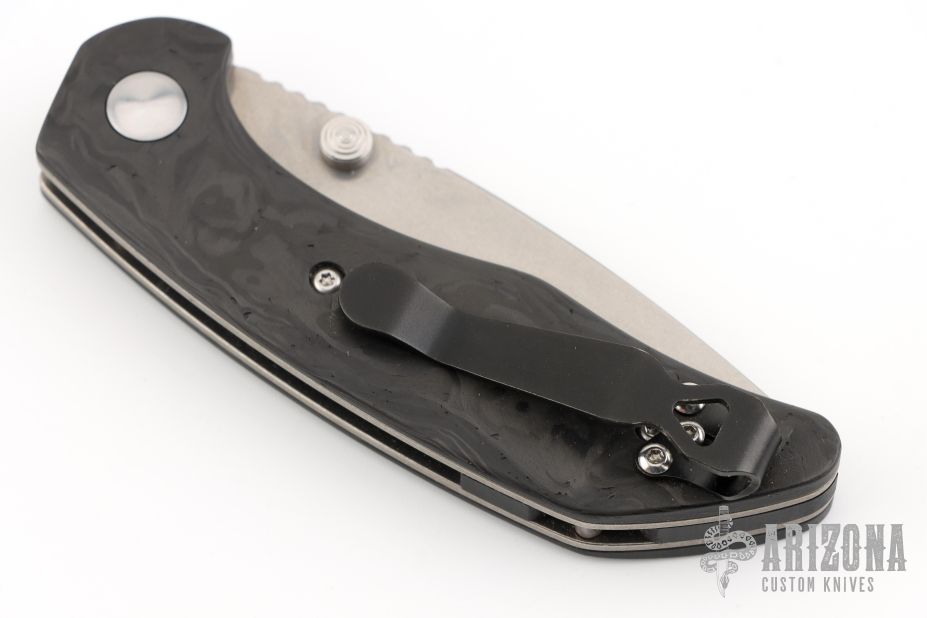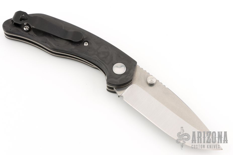 This Model 75 from Jesse Jarosz has a satin finished blade with stonewashed flats, dual thumbstuds and a notched thumbrest. The handle has marble carbon fiber scales with tumbled titanium liners and black G-10 backspacer with lanyard pin, black deep carry tip up reversible titanium clip. Nice detent, lockup, and blade seating. Has some light scratches, otherwise excellent condition.